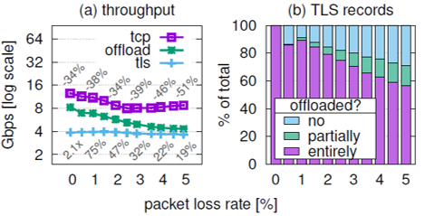 评测结果显示1)在CPU性能满的情况下,自主卸载有助于提高吞吐量;在CPU性能未满的情况下,自主卸载有利于降低CPU负担;2)接收端对乱序和丢包的敏感性更高;3)自主卸载面临因网卡资源耗尽而导致的可扩展性问题。