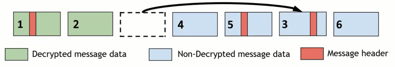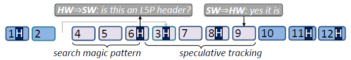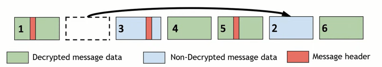 最麻烦的是含有消息头的数据包发生乱序,如图8。这种情况下不能用上述方法,因为根本不知道消息头跑到了哪里。此时需要用到约束条件中提到的magic pattern。网卡对接下来的数据包进行搜索,寻找magic pattern,找到之后就代表这个地方可能是消息头,但还不确定,因为有可能数据被加密之后正好成为magic pattern的样子,所以接下来网卡将这一部分这个“嫌疑人”发给软件端检查,同时网卡假定它的确是消息头对随后的数据进行状态更新(但不计算),直到软件返回检查结果。