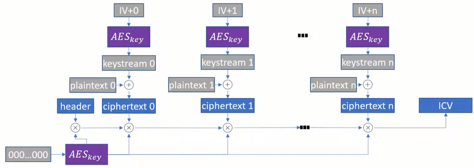 文章中采用的加密方法是AES-GCM方法。首先使用AES算法对初始向量进行运算生成16B kerstream,每一个keystream对16B的明文进行异或操作,生成16B的密文。第二个16B明文使用的初始向量是第一个16B的初始向量加一,以此类推。最后将全零用AES加密后的结果和包头以及所有密文做累乘得到ICV字段。可以看到这一计算过程是符合增量计算和数据量保持的。