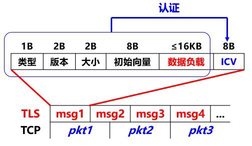 TLS是一种给TCP数据包进行加密的协议。一个TLS消息格式如图4所示,初始向量是一个随机值,前面五个字段进行一系列认证计算后生成包尾ICV,接收方用作认证。